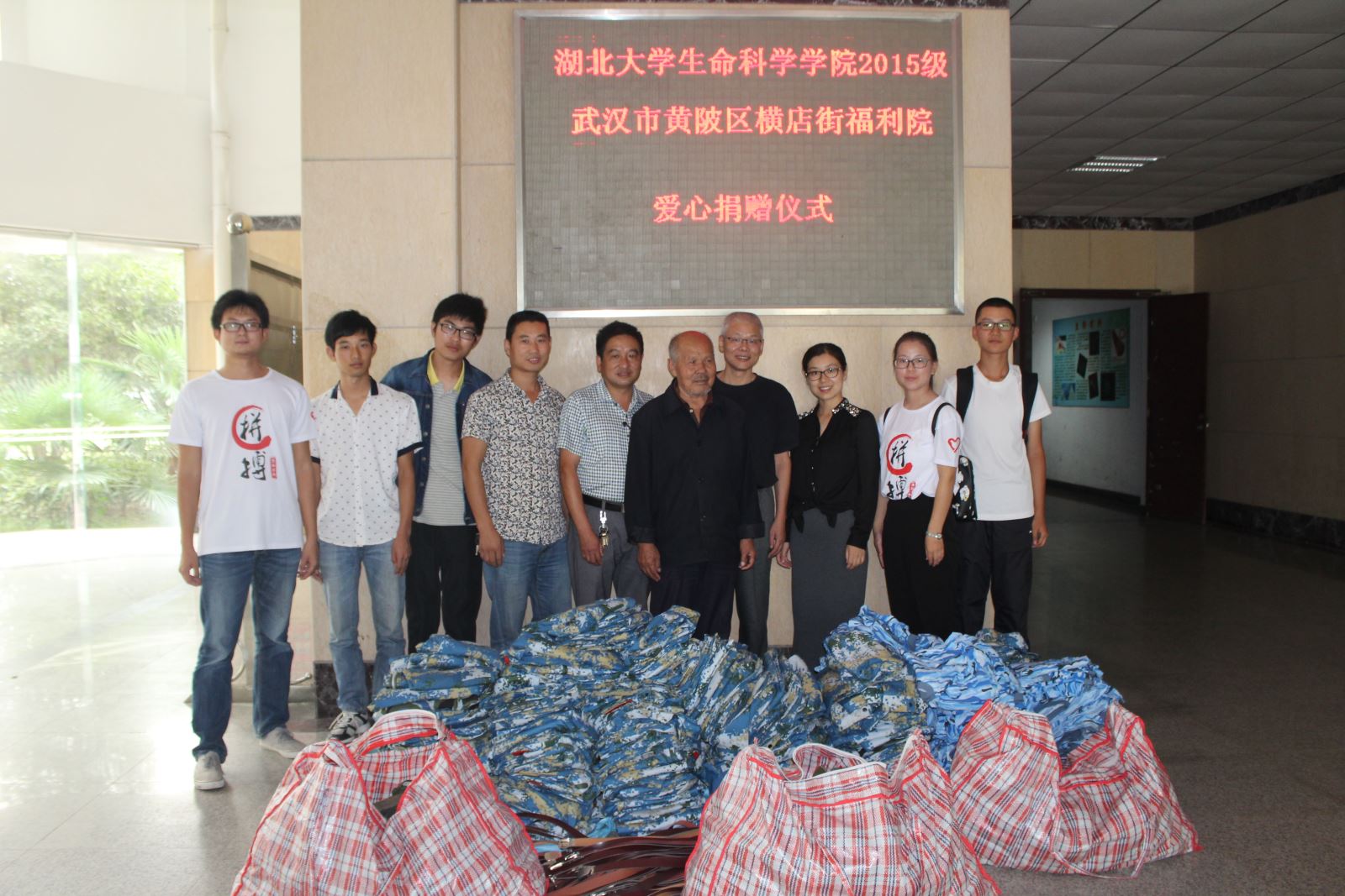 10月4日,在这国庆佳节的第四天,一项温暖的捐赠仪式在公司举行:2015级新生向武汉市黄陂区横店街福利院捐赠军训服。