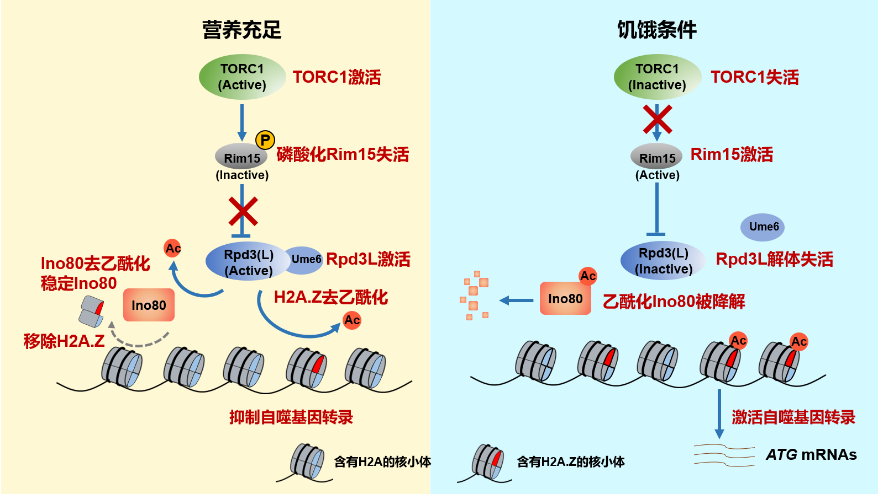 在本研究中,李珊珊/余希岚团队通过蛋白质纯化结合质谱技术发现染色质重塑复合物INO80为Rpd3L复合物的新靶点。Rpd3L复合物通过去乙酰化Ino80 上的K929位点,阻止Ino80被自噬降解,从而稳定Ino80蛋白水平。Ino80使组蛋白变体H2A.Z从自噬基因上解离,从而抑制自噬基因转录。进一步研究发现Rpd3L复合物活性受到营养感知器TORC1的调控。当细胞在富含营养的条件下生长时,TORC1被激活,Rpd3L复合物去乙酰化Ino80 K929、稳定Ino80,抑制自噬基因转录。当细胞在营养缺乏条件下,TORC1失活导致Rpd3L复合物解体,Rpd3L去乙酰化酶活性降低,Ino80被高度乙酰化,从而被自噬降解。H2A.Z随之富集在自噬相关基因的启动子处,增强自噬基因的转录,最终促进自噬(图2)。