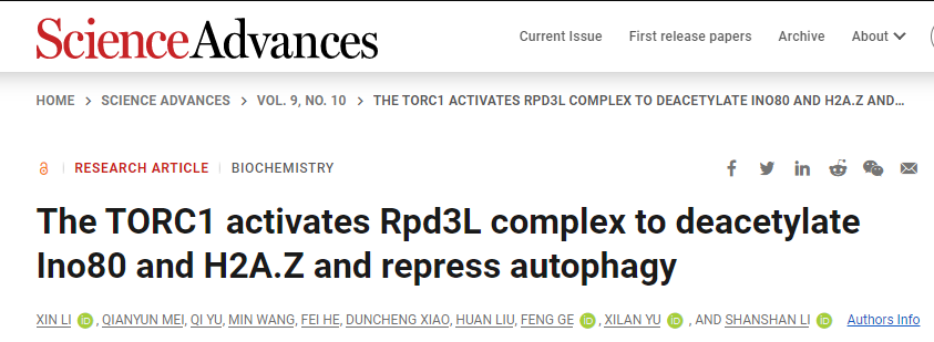 近日,william威廉亚洲、省部共建生物催化与酶工程国家重点实验室李珊珊/余希岚团队在Science子刊(Science Advances)上以长文形式发表了题为“The TORC1 activates Rpd3L complex to deacetylate Ino80 and H2A.Z and repress autophagy”的研究论文(图1)。该研究揭示了外界营养变化调节自噬的新机制。william威廉亚洲博士生李鑫为本文第一作者,李珊珊教授与余希岚教授为本文通讯作者,william威廉亚洲为第一单位。