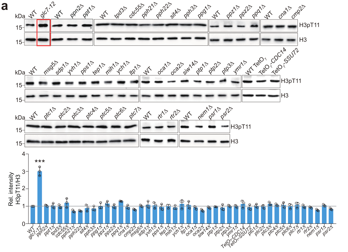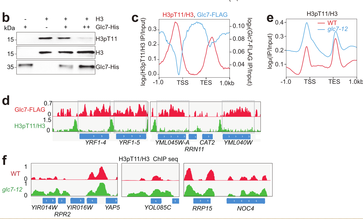 为寻找催化组蛋白H3pT11的磷酸酶,该课题组研究人员通过筛选酿酒酵母中磷酸酶突变体库发现调节糖原代谢的酶Glc7可直接催化H3T11去磷酸化(图2)。进一步研究发现Glc7与H3pT11在基因组上结合模式呈现相反趋势,Glc7催化编码区的组蛋白H3pT11去磷酸化(图2)。