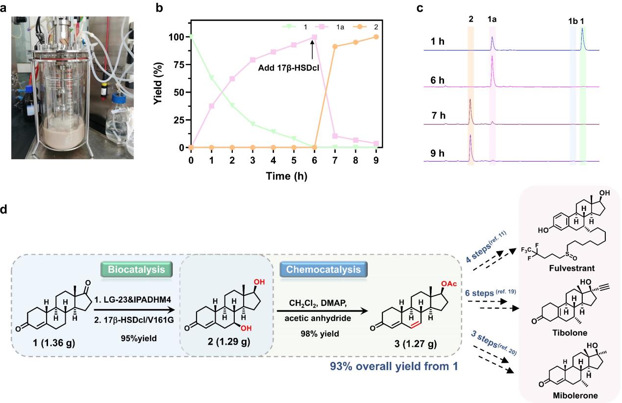 针对上述问题,该团队设计了一种新的化学酶法合成路线(图1b),该路线包括一锅生物催化19-去甲雄烯二酮(1)转化为C7β-羟基诺龙 (2),随后进行化学脱水和酯化反应,引入双键和对C17进行酯化,得到产物脱氢诺龙醋酸酯 (3)。为实现这一目标,该团队对实验室已有的P450单加氧酶突变体库进行筛选,发现了一个P450-BM3突变体LG-23 对底物19-去甲雄烯二酮 (1) 具有约95%选择性,产物经鉴定为C7β羟基化产物。随后作者以LG-23与17β羟基脱氢酶构建生物催化体系,成功实现19-去甲雄烯二酮 (1)到7β-羟基诺龙 (2)的完全转化。再经过一锅一步两步法的化学催化,得到了目标产物脱氢诺龙醋酸酯并实现了脱氢诺龙醋酸酯的克级制备,总产率高达93%(图2),远超过传统化学合成方法的产率 (68%)。本研究开发的这一化学酶法策略不仅合成效率高,而且环保性显著优于传统的化学合成策略,这显示了这一新技术在实际应用中的合成潜力。