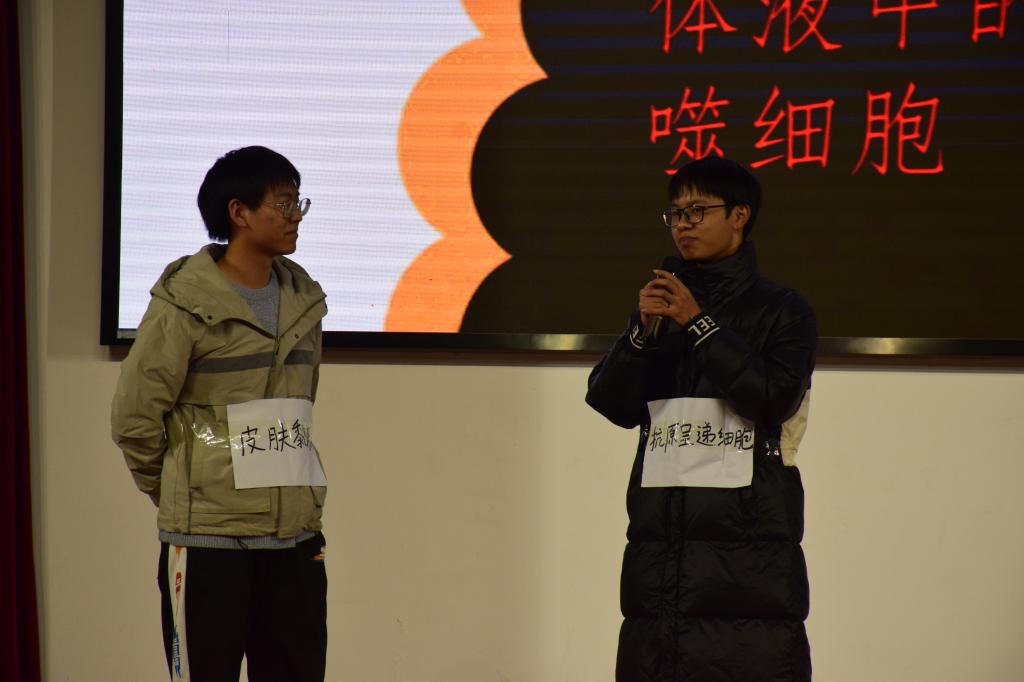 到了最后一个环节——生物小剧场,五个参赛小组可谓都是精心准备。“坚强的芽孢杆菌队”以视频的形式介绍了病毒入侵的机制,“发际线总和我做队”“巴啦啦小魔仙队”和” 1921队”分别惟妙惟肖地表演出了三级免疫机制,人体免疫防线,疫苗的大用处。而“少年先疯队”则为大家描绘了溶酶体在细胞中不可或缺的地位。他们丰富多样而引人入胜的表演,让观众们在投以热烈掌声的同时,也学到了相关的知识。