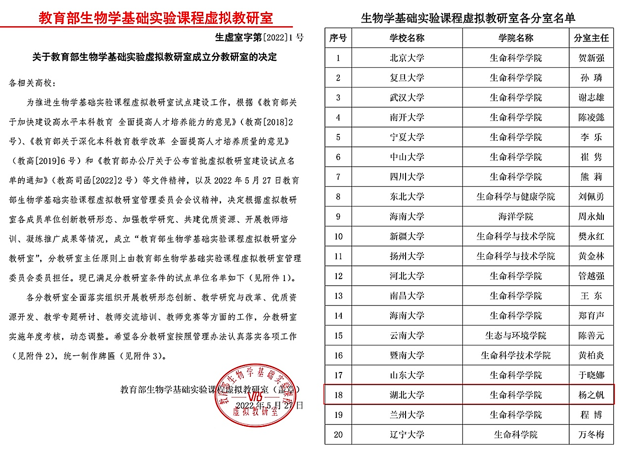 教育部下发文件《教育部办公厅关于公布首批虚拟教研室建设试点名单的通知》(教高厅函〔2022〕2号),公布了首批虚拟教研室建设试点名单。根据名单,教育部首批建设课程(群)教学类虚拟教研室237个、专业建设类虚拟教研室137个、教学研究改革专题类虚拟教研室65个。由吉林大学牵头联合国内53所高校和高等教育出版社共建的“生物学基础实验课程虚拟教研室”位列其中。