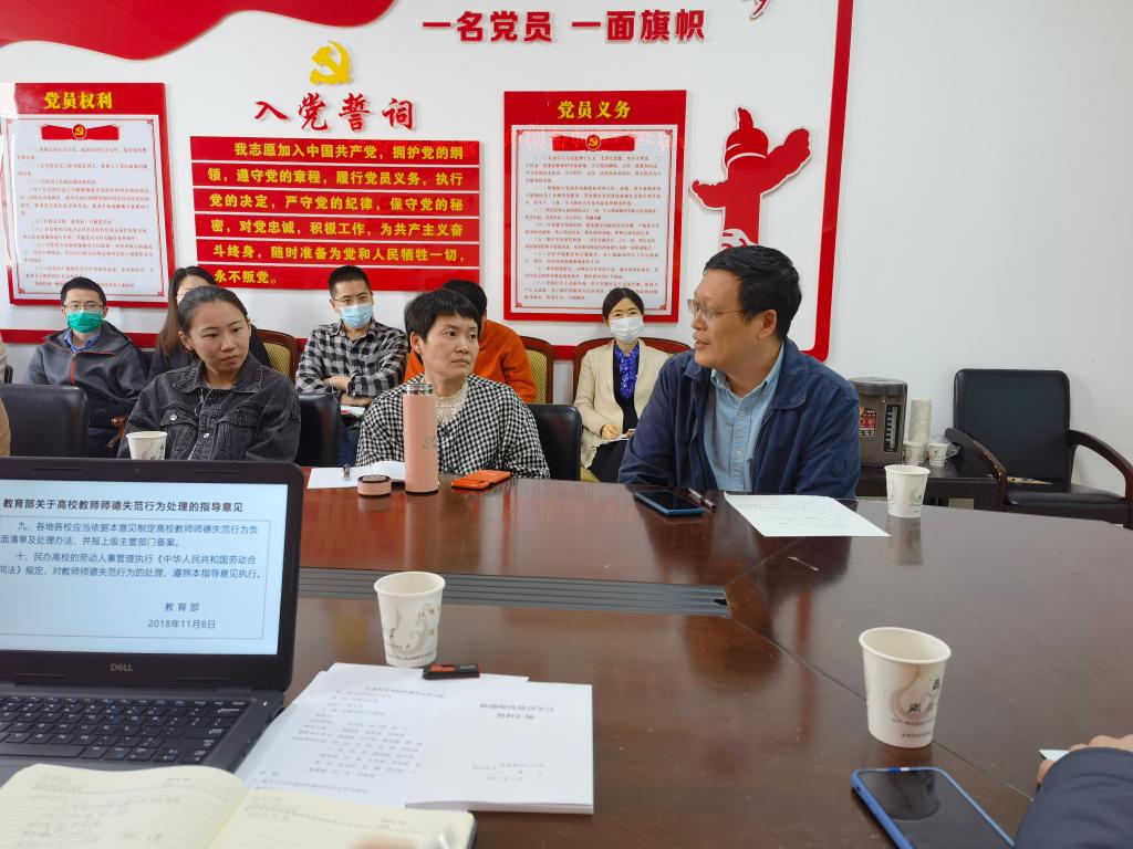 谢玉平书记领学了《新时代高校教师职业行为十项准则》、《教育部关于高校教师师德失范行为处理的指导意见》等国家关于高等公司师德建设的文件要点。他指出,党和国家高度重视教师思想政治教育和师德师风建设工作,提出了一系列新理念、新标准、新要求,并制定和出台了系列制度和文件,希望广大教师能够结合《william威廉亚洲师德师风建设学习资料汇编》进行自主学习,坚持“四个相统一”、争做“四有好老师”,当好“引路人”