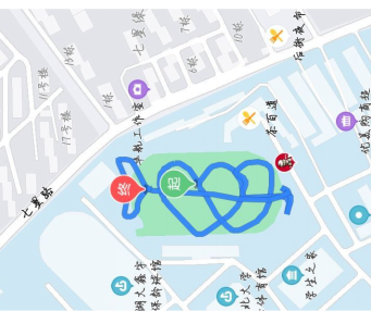创动趣生不仅是运动的锻炼,更是同学们创意的体现。虽然是跑步,但要跑出花样、秀出特色。每个人都可以制定属于自己的独特跑步路线,最后跑出独一无二的图案来。这次的活动无疑是成功的,很多同学发挥想象力,跑出了让人惊艳的图案——党徽、U形管、一箭穿心、五角星、小恐龙、爱心……
