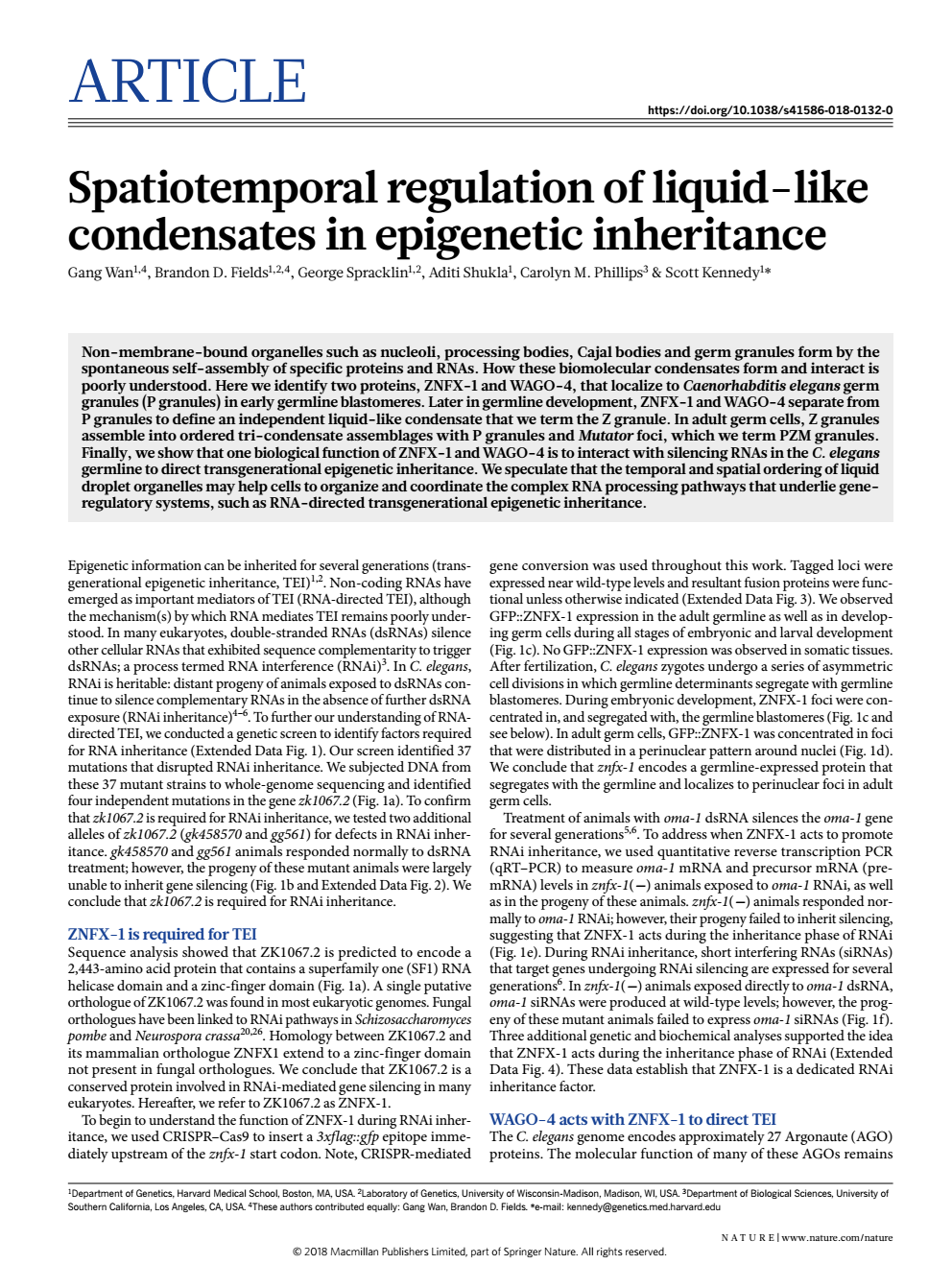 日前,william威廉亚洲2005级硕士研究生员工万刚博士在Nature杂志发表题为“Spatiotemporal regulation of liquid-like condensates in epigenetic inheritance”的长篇研究性文章(Article)。Nature是世界上最早的国际性科技期刊,自从1869年创刊以来,始终如一地报道和评论全球科技领域里最重要的突破,影响因子为40.137