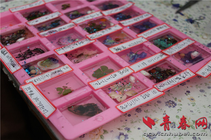 据活动负责人徐玲介绍,树脂胶是提前由工作人员用A、B两种试液按照25:10的比例调好,到场参赛的同学只需要选择自己的模具和放到模具里的东西即可。然后用胶头滴管把树脂胶吸起来,滴到模具里,将要放进去的东西摆弄出自己喜欢的样子,再滴上树脂胶,风干十二小时后即成成品。这些琥珀成品会贴上参赛者标签,由活动方保存。有的同学选择了荧光材料,于是做出的琥珀在夜里发出了淡淡的荧光,这就是晚上的荧光琥珀展的作品。