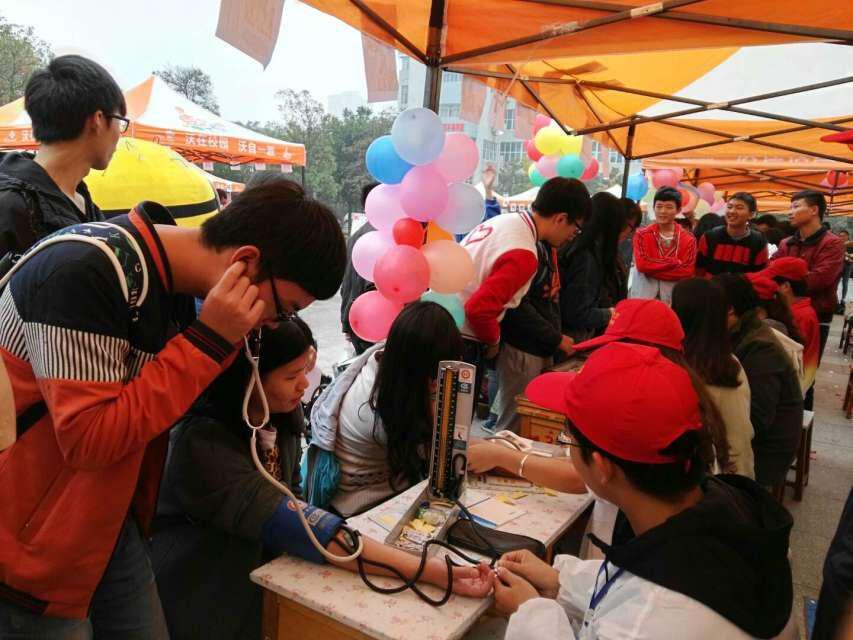 活动前,各院为布置场地做足准备,为活动完满结束打下了坚实基础。通过摆点分发宣传单的前期宣传为此次活动积攒不少人气,使得当天活动细雨蒙蒙却仍有不少人前来参与到活动当中。活动伊始,各院为传播健康知识和播洒爱心使出浑身解数,其中不少公司选择用知识问答的形式来普及员工对于健康方面的认知,例如生科院“健康一站”