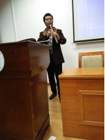 娄策群老师首先播放了笛箫协奏曲《兰花花》,讲座就在清亮的笛声中开始了。娄策群老师主讲中国笛箫文化之当代中国竹笛艺术风格,并指出:“按照约定俗成的习惯,笛箫分为‘南派’和‘北派’,事实上,南北派之分过于笼统,当代中国竹笛已形成了多种具有鲜明地域特色的艺术风格。”第二版块为浅谈笛箫的演奏与技巧,主讲人是徐勉老师。他向大家展示了几种类型的笛子,重点介绍了“唇气指舌”的四大基本功,且强调了勤练对于笛箫演奏的重要性,“生命不息,笛声不止”是他的人生格言。随后他带来了琴箫独奏《绿野仙踪》和《梅花三弄》,同学们则报以热烈的掌声。鲍志新老师介绍了笛箫的生产制作、挑选与保养方面等问题,同学们听后深觉大有裨益。最后的问答环节大家都很踊跃,答对的同学得到了一根笛子,喜悦之情溢于言表。