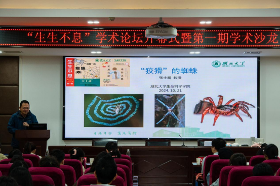 开幕式后,第一期学术沙龙正式开启。张士昶教授以《狡猾的蜘蛛》为主题,详细介绍了公司“蛛形学”这一优势学科的发展历史,并趣味讲述了蜘蛛的身体构造、蜘蛛的捕食与反捕食行为、蜘蛛的性选择行为和蜘蛛的用丝技巧。张老师的趣味讲述引得现场师生连连惊叹。随后。2022级博士研究生黄浩东从科研入门指南、实验设计与数据收集方法论述、科研成果呈现与论文写作技巧、个人成长规划与职业发展建议四个方面详细展示了实用科研的进阶之路。在互动环节,与会师生与主讲嘉宾展开热烈讨论,主讲嘉宾对大家提出的问题进行了深入细致的解答。