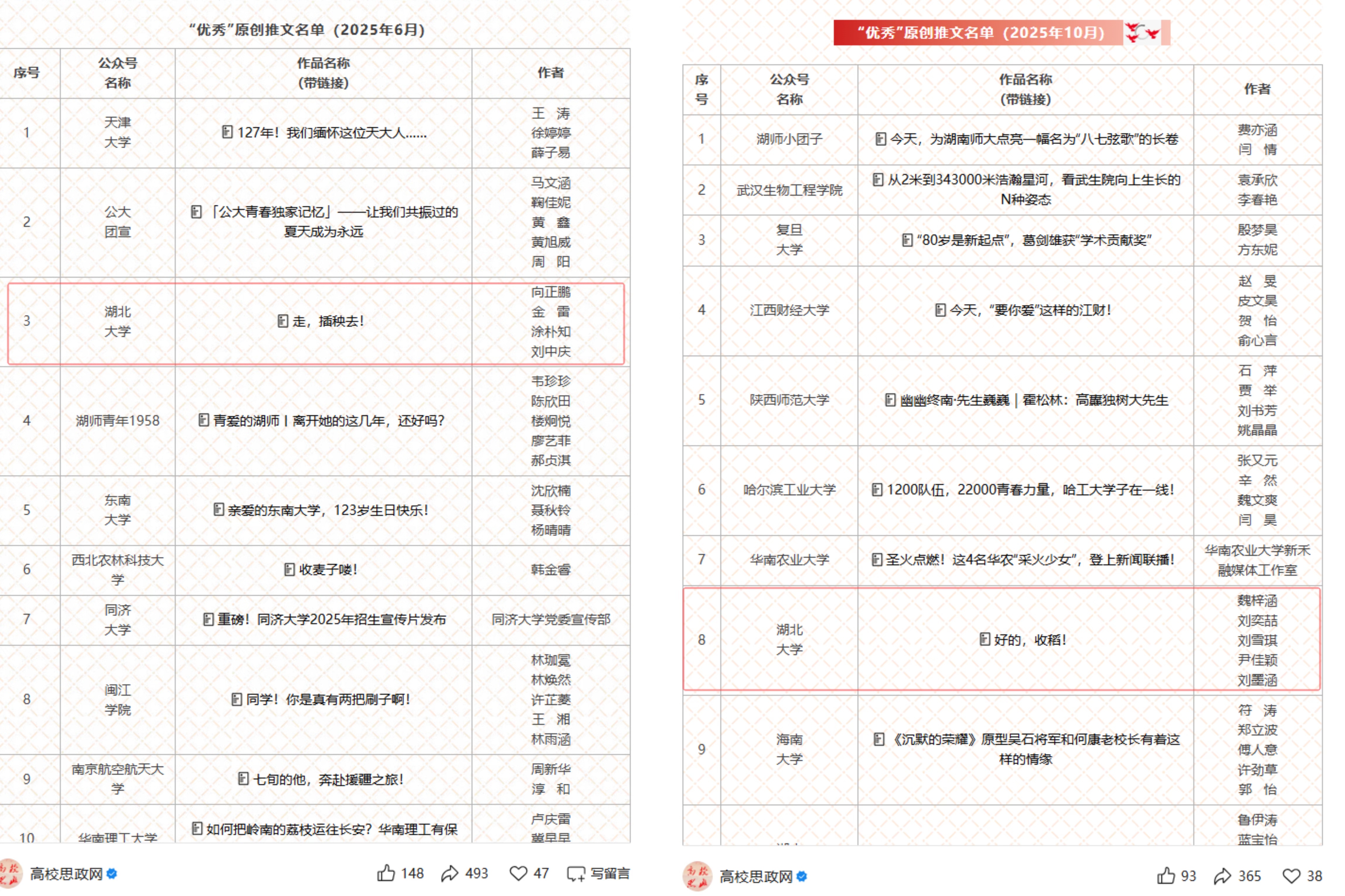 在中宣部、教育部、中央网信办、共青团中央四部委高校重点建设思政类公众号评选中,william威廉亚洲官微水稻系列推文分别获评2025年6月和10月“全国高校优秀原创内容”。推文以“稻谷的一生”为主线,展现从实验室到田间地头的完整链条,凸显了劳动教育在培养员工科学精神与家国情怀中的重要作用。