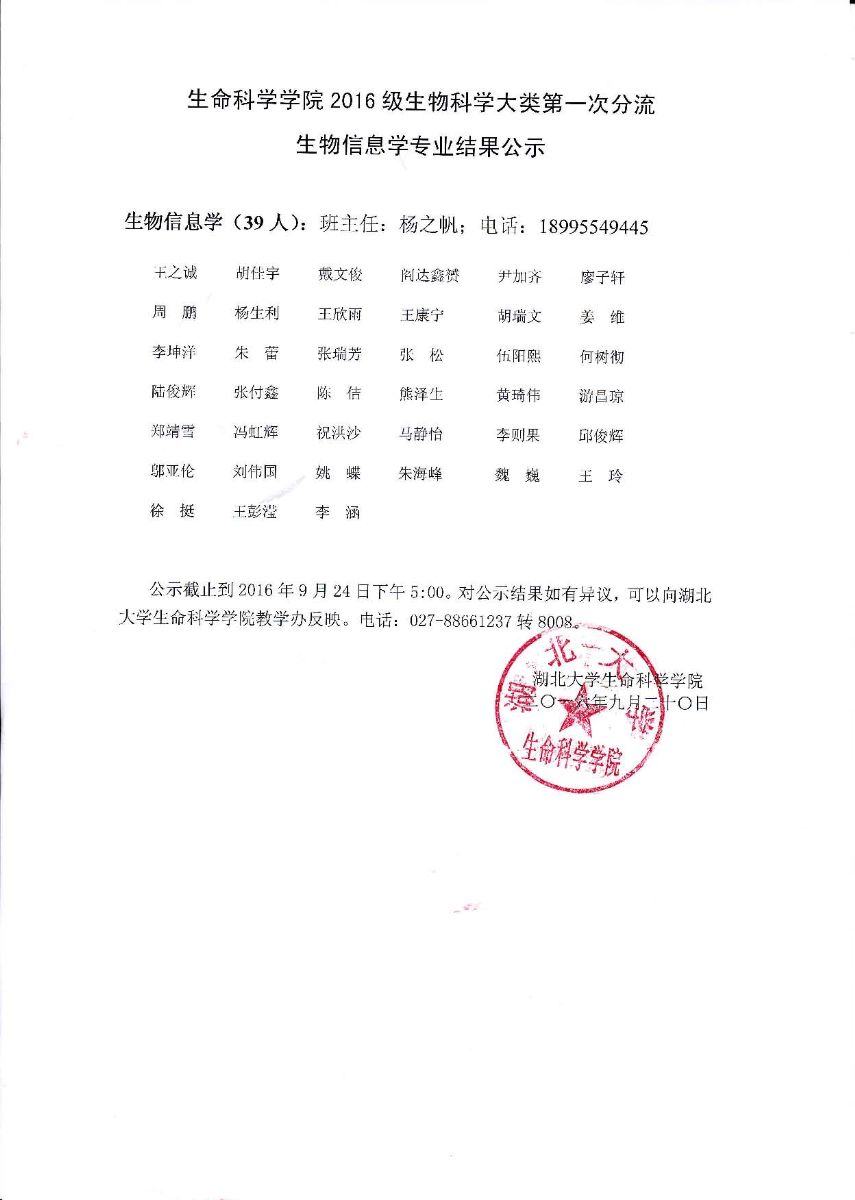 2016级生物科学大类第一次分流生物信息学专业结果公示