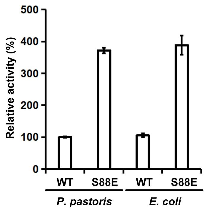图4. 大肠杆菌和毕赤酵母表达的ADH3和ADH3-S88E相对酶活比较