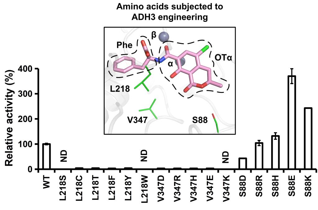 在获得了ADH3与赭曲霉毒素A的精细三维结构模型后,郭瑞庭教授团队进一步对ADH3与赭曲霉毒素A的结合口袋进行结构分析与理性设计,通过对氨基酸位点S88、L218和V357进行突变,以增强ADH3与赭曲霉毒素A之间的亲水作用力或者芳香环堆积力,最终成功获得了一个对赭曲霉毒素A水解效率大幅提升4倍的突变体蛋白ADH3-S88E(图3)。