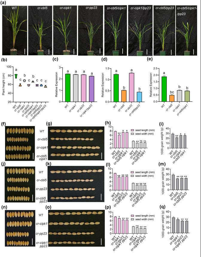 通过酵母双杂交实验、双荧光素酶互补以及Pull-Down证明了CBL5,CIPK1和PP23两两互作,并通过Crisper-Cas9分别构建单突,双突和三突植株,并通过表型分析和表达量分析等表明了CBL5和CIPK1以及PP23的遗传关系。通过研究揭示了CBL5,CIPK1和PP23参与了赤霉素途径调节水稻籽粒大小,其中CBL5和CIPK1不仅参与了赤霉素合成途径(促进内源活性赤霉素GA4含量)还参与了赤霉素信号转导途径,PP23仅参与了赤霉素信号转导途径。结果表明CBL5-CIPK1-PP23作为一个模块共同通过参与赤霉素途径影响水稻籽粒大小和重量。这一发现不仅丰富了水稻籽粒大小的调控网络,而且在提升水稻产量方面具有较好的应用前景。