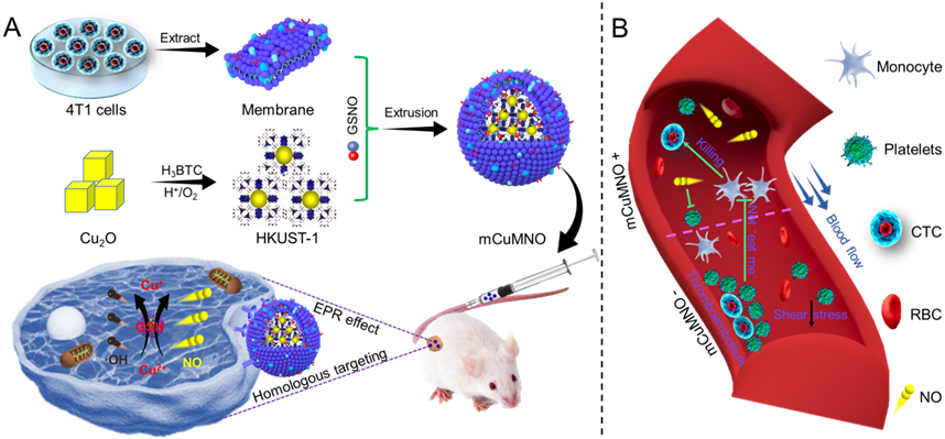 (A) mCuMNO纳米体系合成路线及其体内治疗机制。(B) NO在血管内抑制血小板激活阻碍循环瘤迁移机制。