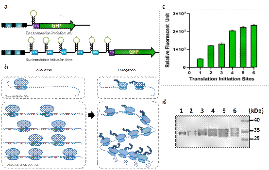 图1. 地衣芽胞杆菌中蛋白表达水平随mRNA前导区RBS序列拷贝数的增加而增加。a. 绿色荧光蛋白的mRNA前导区含有起始密码子的RBS序列的串联,其中茎环上的绿色部分为SD序列,蓝色方框为起始密码子;b. 多拷贝RBS序列(RRBS)对于mRNA翻译起始和延伸影响的模型猜想c.胞内绿色荧光强度随RBS序列拷贝数的增加而增加;d. 纯化后绿色荧光蛋白的条带数与其前导区的RBS拷贝数相对应,证实了存在多翻译起始位点。