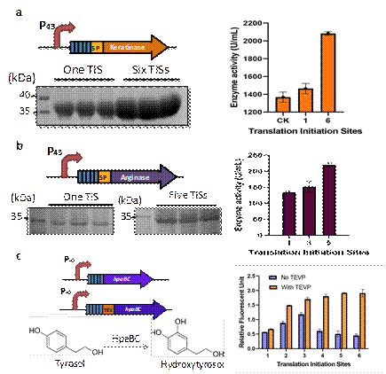 图2. 地衣芽胞杆菌中多拷贝RBS(PRBS)对于胞内外蛋白表达的影响。a. 对角蛋白酶胞外表达量和酶活的影响;b. 对精氨酸酶胞外表达量和酶活的影响;c. 多拷贝RBS(PRBS)用于羟基酪醇的全细胞催化,在表达胞内蛋白时,由于目的蛋白具有多翻译起始位点,其前端多余的氨基酸序列可能会影响胞内蛋白的折叠,从而降低酶活,因此我们在地衣芽胞杆菌的基因组上整合了TEV蛋白酶,并在多拷贝RBS和编码基因间加入TEVP酶切位点。结果表明,加入TEV酶切位点后,羟基酪醇的转化率随RBS拷贝数的增加而增加