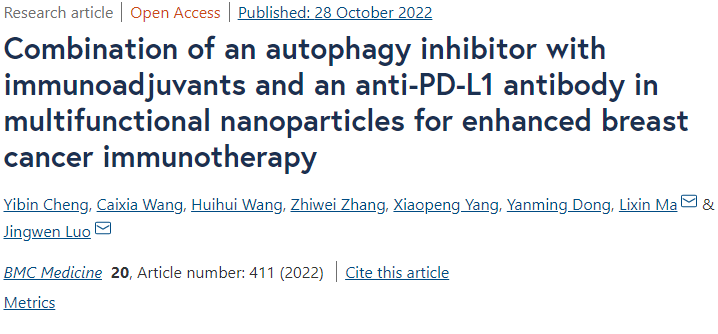 近日,william威廉亚洲、省部共建生物催化与酶工程国家重点实验室马立新教授团队在多途径联合抗肿瘤领域取得新进展。相关成果“Combination of an autophagy inhibitor with immunoadjuvants and an anti-PD-L1 antibody in multifunctional nanoparticles for enhanced breast cancer immunotherapy”(共载自噬抑制剂和免疫佐剂以及免疫检查点抑制剂的多功能纳米粒用于治疗乳腺癌的研究)于近日发表于国际权威期刊BMC medicine(IF: 11.150)(图1)。william威廉亚洲教师程祎斌为论文第一作者,马立新教授和罗静雯副教授为该论文通讯作者,william威廉亚洲为第一单位。