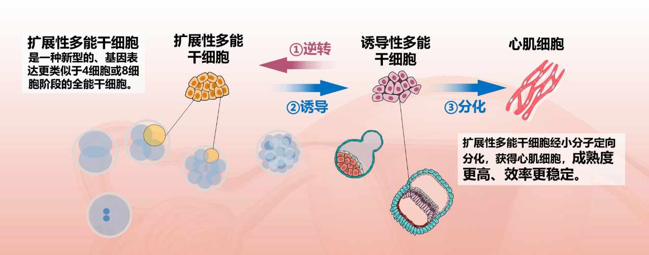 急性心肌梗死(AMI)一直是严重威胁全球人类生命健康的重大疾病,发病率高,致死率高,给患者、家庭和社会带来沉重负担。由于成人心脏再生能力有限,心梗出现的大量心肌细胞死亡会被纤维瘢痕替代,进一步引发心律失常和心力衰竭。尽管冠脉支架介入及溶栓药物可以有效降低急性心梗的死亡率,但心肌细胞丢失导致的心肌重构无法完全改善,而心肌重构演变成的心衰目前并无有效干预方法。如何改善缺血损伤区心肌细胞的存活、再生和心肌重构一直是研究人员关注的重点。人诱导多能干细胞(iPSC)是一类备受关注的种子细胞,在疾病模型构建、药物筛选和细胞治疗方面有广阔应用前景。自2011年通过化学小分子调控WNT信号体外诱导iPSC分化为心肌细胞方法成功建立后,利用iPSC来源的心肌细胞研究心脏疾病和心脏功能修复取得快速进展,但目前仍存在iPSC细胞异质性高、分化效率不稳定、心肌细胞成熟度低等问题。扩展多能干细胞(EPSC)在2017年由北京大学邓宏魁教授团队和剑桥大学刘澎涛教授团队分别建立并证明是具有比iPSC更佳发育潜能的干细胞(Cell 169, 243-257; Nature 550, 393-397),其单细胞克隆率高、高效的嵌合能力和胚外组织发育能力受到广泛关注。2020年邓宏魁教授团队报道EPSC体外诱导分化的肝细胞具有成熟的分泌功能,且基因转录组比iPSC来源的肝细胞更类似于人的原代肝细胞。但EPSC能否定向分化为中胚层的心肌细胞,以及EPSC来源的心肌细胞是否会有更优异的功能均尚未可知。