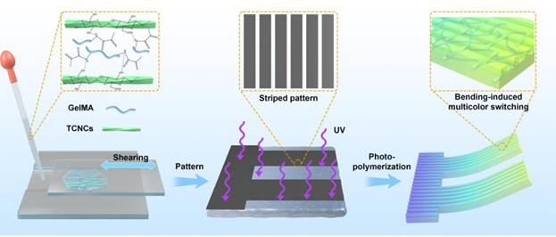 维素纳米晶体在剪切力的作用下,形成高度有序的排列,在正交偏振片下呈现均匀的干涉色。这种干涉色源于各向异性材料在垂直和平行于取向方向产生两束偏振光的相位差。该相位差与材料厚度、折射率差(双折射率)和入射光波长相关。因此,当材料厚度和双折射率发生变化时,会产生相位差的变化,进而变干涉色。