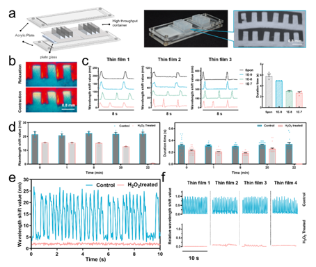 本工作提出一种简单且有效的策略制备功能性水凝胶,其表面具有微图案化、内部包含有序的纳米纤维素。心肌细胞的自主搏动可以驱动水凝胶悬臂同步变形,引起水凝胶干涉色周期性变化,从而实现心肌细胞收缩力的可视化。为更高效的对心肌细胞进行评估,将上述水凝胶微型化后集成到高通量设备内,形成一个多腔室大规模的系统,能在同一视野下实时监测多组心肌的收缩力的变化,提高检测效率。本工作不仅为体外心肌细胞研究提供了新思路,也为单个心肌细胞检测和体外心脏组织工程可视化检测提供了可能。