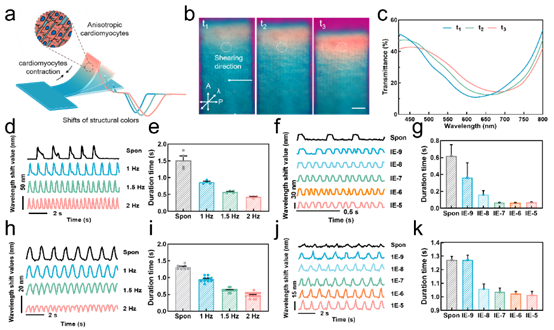 将海鞘纤维素纳米晶体在凝胶预聚液中剪切取向,利用光掩膜紫外光引发聚合制备表面具有条纹凹槽结构的各向异性水凝胶薄膜(图1)。将心肌细胞接种水凝胶薄膜表面,诱导其定向生长。在心肌细胞收缩/舒张过程中,水凝胶悬臂发生形变,引起水凝胶干涉色同步变化,通过结合微区光谱仪监测心肌细胞的变化。此外,水凝胶的每个悬臂均可实现微型化,为体外高通量可视化检测心肌细胞收缩力提供可能,实现对心肌细胞的收缩频率的定量检测。通过这种非侵入细胞的手段,可以减少组织毒性,延长对细胞的监测时间(图2)。