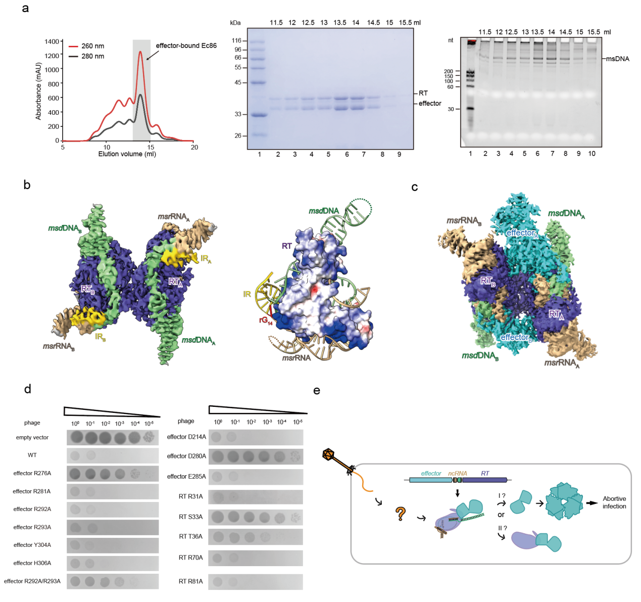 图2. 细菌Retron-Ec86复合物的组装(a)、逆转录酶和msDNA的二元复合物结构(b)、Retron结合效应蛋白的三元复合物结构(c)、Retron系统抵抗噬菌体感染 (d)以及Retron系统的工作模型(e)