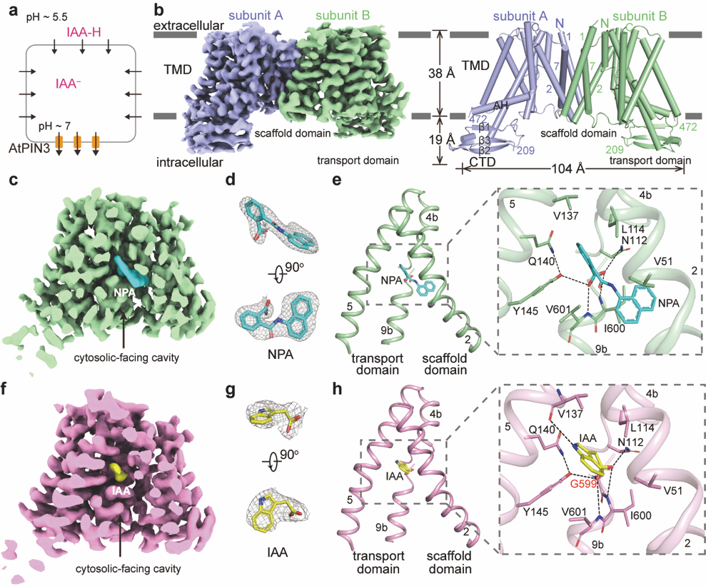 图1. AtPIN3的结构。a. 3H-IAA转运体系模式图。b. AtPIN3的密度图和结构图。c. AtPIN3NPA的密度图。d. NPA的密度图。e. AtPIN3NPA结构中NPA的结合位点。f. AtPIN3IAA的密度图。g. IAA的密度图。h. AtPIN3IAA结构中IAA的结合位点。