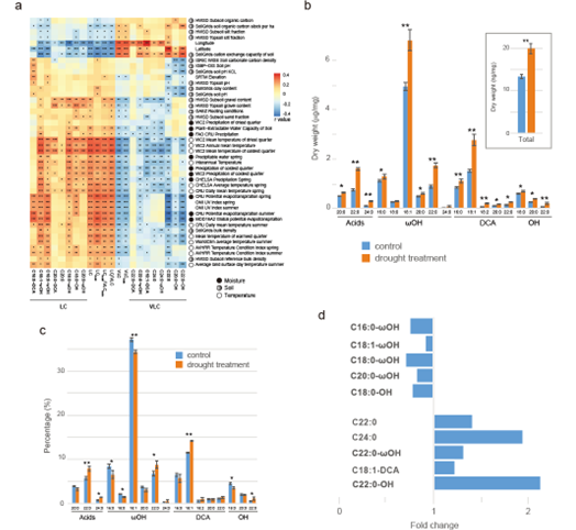 木栓质(Suberin)是由脂肪族化合物、芳香族化合物和甘油等组分通过酯化反应聚合而成的一类疏水性聚合物,能够在维管植物根内皮层的径向和横向细胞壁内侧沉积,形成一层疏水性的屏障,不仅在控制根系水分流动及物质运输方面起着重要作用,而且在植物响应干旱、盐胁迫和病原菌侵染等各种环境胁迫因子过程中发挥着关键作用。为了深入探讨根内皮层木栓质在植物适应环境过程中的作用,吕世友教授研究团队利用世界范围内分布的218份野生拟南芥生态型进行了分析。首先定量分析了拟南芥根中16个木栓质单体成分的自然变异,发现这些单体成分在拟南芥自然群体之间存在较大的分化。进而利用相关性分析揭示了木栓质相关性状和降雨量、土壤干湿程度等多个气候变量之间存在显著关联性,表明木栓质的结构和化学组成可能受到自然选择的影响,并表现出对生存环境,尤其是土壤理化性质的适应性(图2)。同时利用全基因组关联分析(genome-wide association analysis, GWAS)鉴定了94个引起木栓质单体组分变异的潜在遗传位点,并证实了GPAT6特异参与木栓质C16单体成分的合成。总之,该研究为进一步解析植物木栓质合成及调控的分子机制提供了候选基因,并为探讨植物适应性进化的机制奠定了基础。