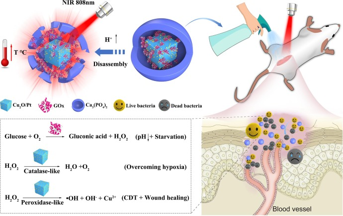作者设计合成了一种酸响应、生物矿化的磷酸钙包裹的Cu2O/Pt纳米反应器,该纳米反应器具有生物可降解性,可在近红外区成像,具有良好的光热效应,同时具有类氧化物酶、类过氧化物酶及类过氧化氢酶活性。利用这些特征,作者探索了其在成像指导下的光热联合化学动力抗菌方面的应用。体外实验结果显示,该纳米反应器可以催化葡萄糖产生双氧水及饥饿效应,双氧水进一步被催化产生羟自由基,联合光热效应表现出良好的抗革兰氏阳性及阴性菌的活性;此外,纳米反应器可缓慢降解并持续释放低浓度的铜离子,促进血管内皮细胞的增殖及迁移。体内动物实验结果显示,该纳米反应器可促进糖尿病大鼠感染创面愈合。分子机制研究进一步表明,该纳米反应器可消耗伤口微环境中的葡萄糖,促进伤口部位血管发生,改善局部缺氧,增加伤口部位胶原沉积从而加速创面修复。