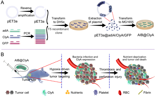 图1. 细菌治疗体系(AIB@ClyA)的构建及其在体内肿瘤治疗示意图。