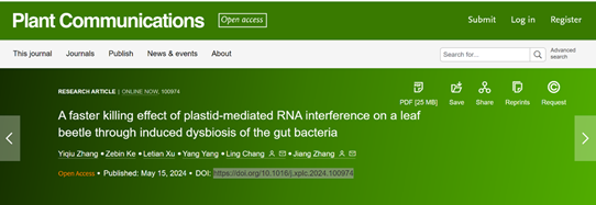 近日,Plant Communications(IF: 10.5) 在线发表了张江教授课题组题为“A faster killing effect of plastid-mediated RNA interference on a leaf beetle through induced dysbiosis of the gut bacteria”(诱导肠道细菌的失调加速质体介导RNAi致死柳蓝叶甲)的研究论文(图1)。该研究该研究发现,与细胞核介导的RNAi技术相比,PM-RNAi技术对柳蓝叶甲的防治效果更强,同时将昆虫肠道细菌和PM-RNAi方法相结合应用于对柳蓝叶甲的防治,明确了肠道细菌恶臭假单胞菌(Pseudomonas putida)能够加速PM-RNAi致死柳蓝叶甲的作用及机制。