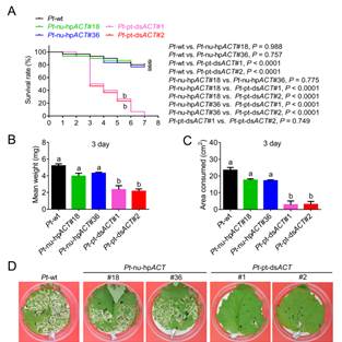 图2 靶向β-Actin基因的转基因杨树植株对柳蓝叶甲幼虫的抗虫性测试