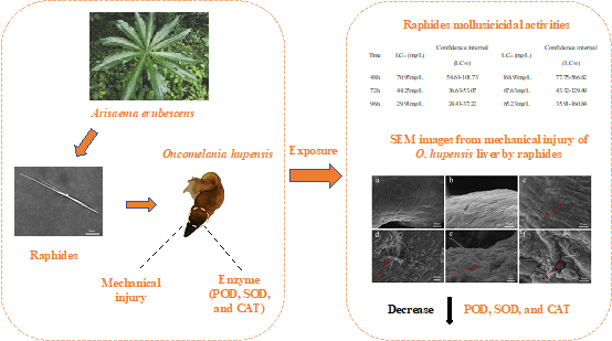 柯文山教授团队从天南星科植物的块茎中提取并纯化了毒针晶,并对其活性成分和杀螺活性进行了详细分析。实验结果显示,毒针晶对钉螺具有强烈的杀灭作用,其半数致死浓度(LC50)在48小时和72小时分别为70.95 mg/L和44.25 mg/L。毒针晶杀螺活性依次为完整针晶>草酸钙晶体>凝集素蛋白(AEL)。此外,钉螺肝脏中的过氧化物酶(POD)、超氧化物歧化酶(SOD)和过氧化氢酶(CAT)活性在早期显著增加,但在后期急剧下降。利用扫描电镜对钉螺肝脏的表面结构进行观察,结果显示,毒针晶对钉螺肝脏的表面结构有不同程度的损伤。该研究表明毒针晶对钉螺的毒性机制是针状草酸钙晶体刺入钉螺肝脏表面产生机械损伤,进而将毒针晶中的凝集素蛋白带入到肝脏中,降低了肝脏解毒酶的活性,产生了严重的毒性反应,最终导致钉螺死亡(图2)。该研究为开发新型生物源杀螺剂提供了理论依据,同时为植物源活性成分在生态毒理中的应用提供了新视角。