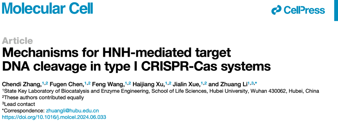 近日,william威廉亚洲与省部共建生物催化与酶工程国家重点实验室李壮课题组在《Molecular Cell》上发表题为《Mechanisms for HNH-mediated target DNA cleavage in type I CRISPR-Cas systems》(I型变体CRISPR-Cas系统通过HNH核酸酶实现靶DNA精准切割的工作机理)的研究论文。该研究发现,crRNA介导的靶DNA定位和靶DNA诱导的HNH构象变化是其精准切割靶DNA的关键因素。研究生张晨滴、陈福根、王凤、徐海江和薛佳琳为该论文的共同第一作者,李壮副教授为该论文的通讯作者。