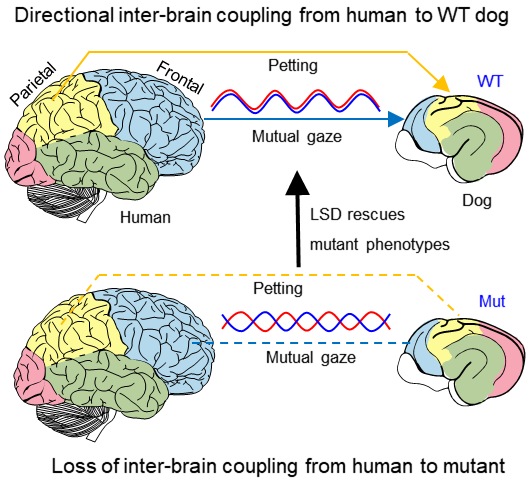 众所周知,家犬是人类最忠诚的朋友,能与人进行亲密而有效的社交互动。然而这种独特的跨物种社交互动的神经机制尚不清楚。跨脑同步化,即同物种不同个体间神经活动的同步,代表了社交互动的神经基础。该研究团队首次发现了家犬与人社交互动时的跨脑同步化现象。该团队通过分析家犬和人在社交互动过程中的脑电信号,发现了互相凝视和抚摸可以分别在家犬与人的额叶和顶叶区域诱导神经活动的同步化。这种同步化的强度随着家犬与人在五天内的熟悉度增加而增强。且通过信息流分析发现,在社交互动过程中脑电信息流方向为从人到家犬,提示在人犬社会关系中人是领导者,而家犬是跟随者。此外,合作团队通过对新建立的孤独症家犬模型研究,发现了孤独症突变犬存在跨脑同步化缺陷和注意力缺陷。针对以上的异常表现,该团队尝试用致幻剂麦角酸二乙酰胺(lysergic acid diethylamide, LSD)进行干预,发现LSD具有显著的挽救效果。该研究首次揭示了家犬与人跨物种社交互动中的神经机制,即跨脑同步化现象,并揭示致幻剂LSD具有改善孤独症社交障碍的临床转化潜力。