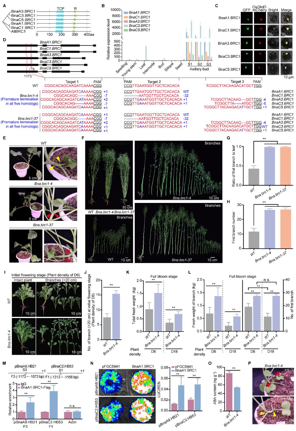 油菜是世界上第二大油料作物,也是中国种植面积最大的油料作物。近几年,为了进一步发展油菜产业和满足消费者的新需求,我国科学家提出了以消费者新需求为导向的现代油菜多功能开发与利用的产业发展战略,充分挖掘油菜各个发育时期的全价值链。增加油菜的分枝数有利于菜薹和生物量的同时提高,对提高菜用、饲用以及肥用的价值开发起着非常重要的作用。然而,油菜中可供育种者使用的显著多分枝种质和潜在基因非常有限。植物中保守的TCP转录因子BRANCHED1/TEOSINTE BRANCHED1(BRC1/TB1)通过整合多种调控分枝发育的外在和内在因素,从而负调控植物的分枝数目。因此,敲除油菜中所有BRC1同源基因可能会产生一种新型的显著多分枝种质。
