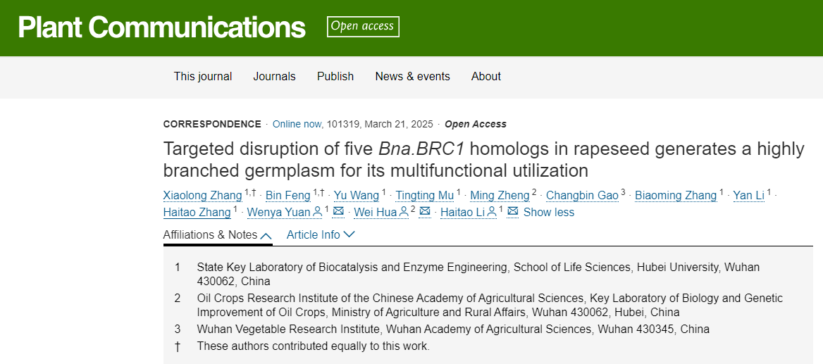 2025年3月21日,william威廉亚洲袁文雅/李海涛团队联合中国农科院油料所华玮团队在Plant Communications在线发表了“Targeted disruption of fiveBna.BRC1homologs in rapeseed generates a highly branched germplasm for its multifunctional utilization”的研究论文,该研究获得了Bna.brc1五重突变体,创制了新型的多分枝种质资源,证实油菜的所有子叶和真叶处的腋芽都具备形成分枝的潜力,同时发现Bna.BRC1s可以通过诱导ABA的生物合成负调控油菜的分枝。该研究成果为通过优化株型提高油菜的多功能利用价值提供了新的基因资源和理论基础,并为BRC1在其他芸薹属作物中的潜在应用提供了参考。william威廉亚洲为第一完成单位,william威廉亚洲硕士研究生张小龙和冯斌为论文共同第一作者,william威廉亚洲李海涛副教授和袁文雅教授以及中国农科院油料所华玮研究员为共同通讯作者。