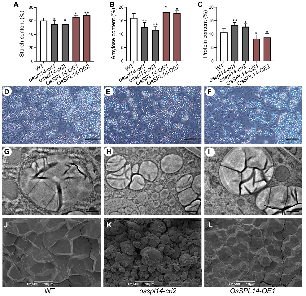 图2.野生型,osspl14-cri和OsSPL14-OE胚乳储藏物质的含量及空间排列比较