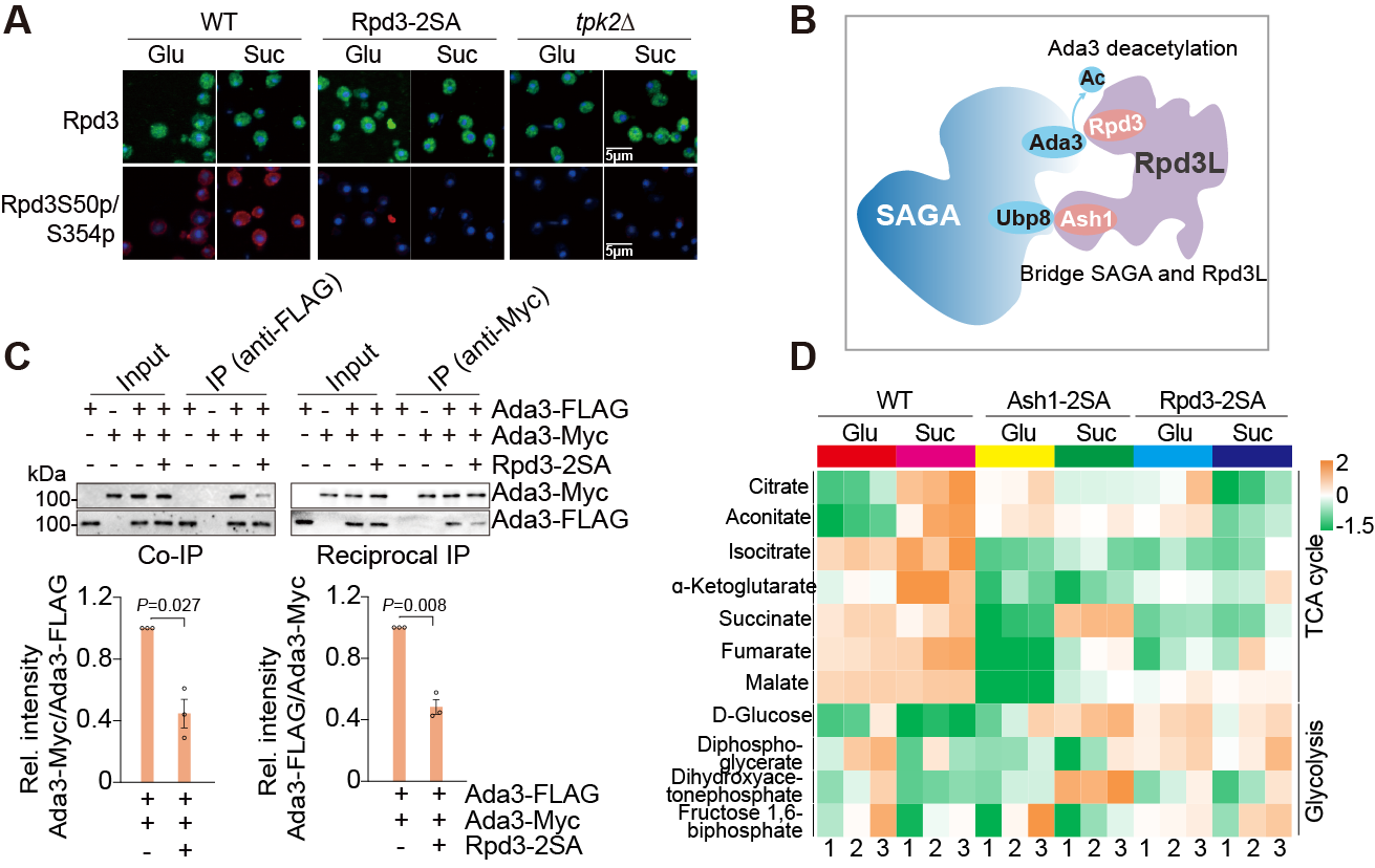 图2 Tpk2通过磷酸化Rpd3调控SAGA二聚化和代谢转换