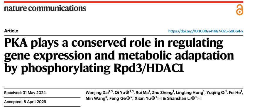 近日,william威廉亚洲、省部共建生物催化与酶工程国家重点实验室李珊珊/余希岚团队在Nature子刊(Nature Communications)上以长文形式(Article)发表了题为“PKA plays a conserved role in regulating gene expression and metabolic adaptation by phosphorylating Rpd3/HDAC1”的研究论文。该研究以酿酒酵母为模型,揭示了蛋白激酶A(PKA)在感知和响应外界营养变化中的新机制,并进一步在哺乳动物细胞和小鼠中验证了其保守性。william威廉亚洲博士研究生代文静和博士后余奇为该论文共同第一作者,李珊珊教授和余希岚教授为该论文通讯作者,william威廉亚洲为第一单位(图1)。