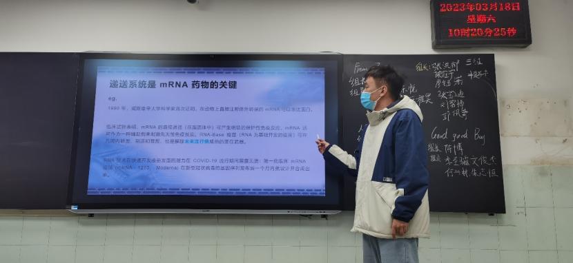 (通讯员:陈悦 陈博 陈永博)3月18日上午,张海谋教授主讲的《分子生物学》课程利用课外时间在教五105举行了本学期第一次讨论会,参加讨论会的除了2021级生物信息专业国重班的全体同学外,还有袁思琪、古丽米拉、查欢三位助教。本次讨论会旨在培养同学们“大胆假设、小心求证”的科学探究精神,前期引导同学们查阅书本和文献,中期同学们进行小组讨论,制作PPT汇报材料,最后在讨论会上展示。
