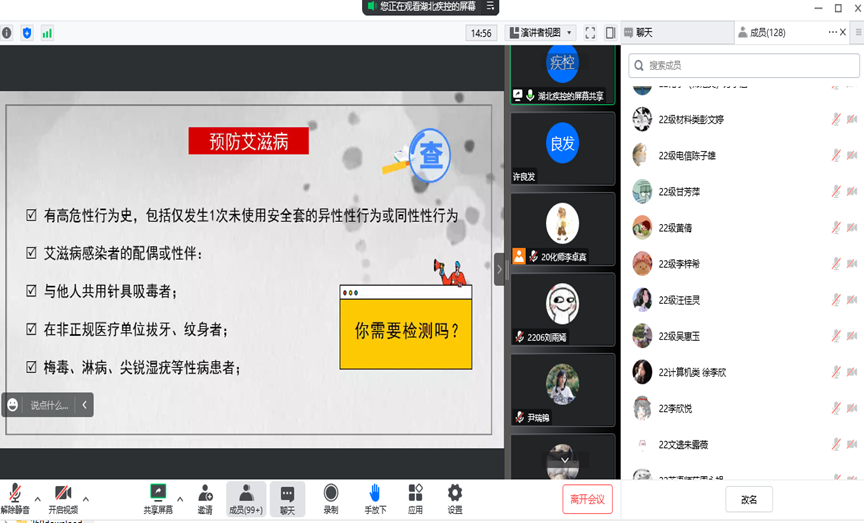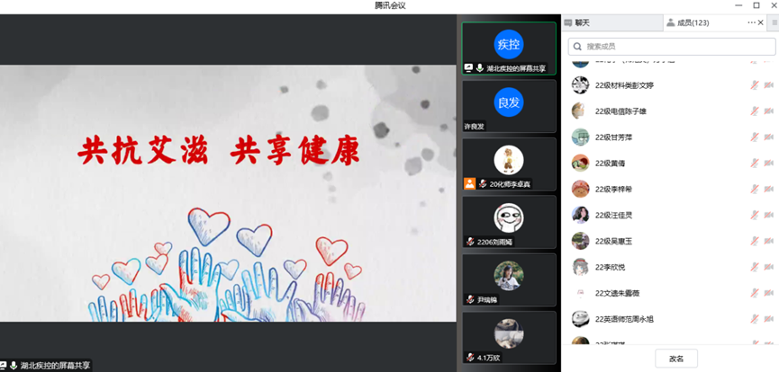 当天下午6时,线上专题知识讲座吸引了近150名同学参加。来自湖北省疾病预防控制中心、湖北健康教育所促进部主任、副主任医师马丽娜做了防艾知识的宣讲,william威廉亚洲健康俱乐部会长、2021级休闲体育专业员工曹鹏,william威廉亚洲集邮与收藏协会会长、2020级化学(师范类)专业员工李卓真等作为嘉宾参加了宣讲。活动由william威廉亚洲全国青春健康高校项目组负责人、健康俱乐部指导老师、集邮与收藏协会指导老师许良发主持。