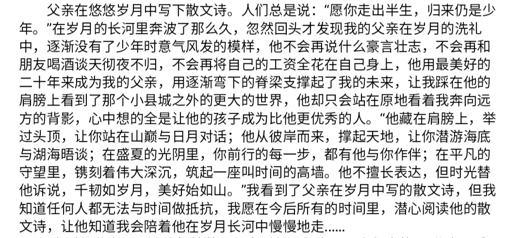 阳光灿烂的六月父亲节如约而至。在特殊的日子里总要做些有意义的事情。于是同学们便一笔一笔地写下了关于父亲的故事。怀着淡淡的惆怅拾起岁月的流光一颗漂泊流浪的心回归了父亲的身旁感恩着父爱如山。同学们用简短的文字描绘了与父亲的点点滴滴这些父亲或质朴憨厚或踏实勤劳或沉默少言但相同的是父亲们都给了自己的孩子伟大而深沉的爱。如大山般巍巍而质朴的父爱如大海般深沉而宽广的父爱如青松样苍翠而挺拔的父爱如金子样默默地发光的父爱因同学们而跃然纸上。
