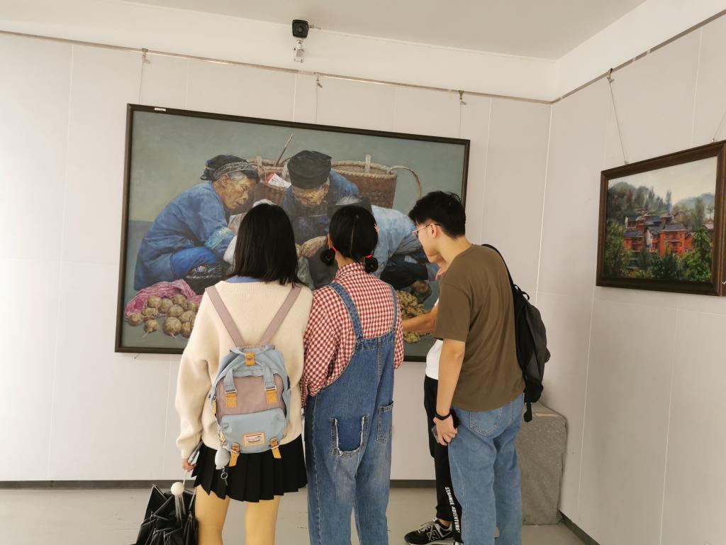 首先,17生师班全体成员于晚上7点在艺术公司门口集合,一起参观艺术公司“不忘初心、牢记使命”庆祝新中国成立七十周年主题作品展。进入展厅后,同学们对绘画作品进行观赏并互相交流。其中,有同学惊叹油画作品的色彩美丽,也有同学关注到这些画作记载的新中国成立以来的历史变迁。