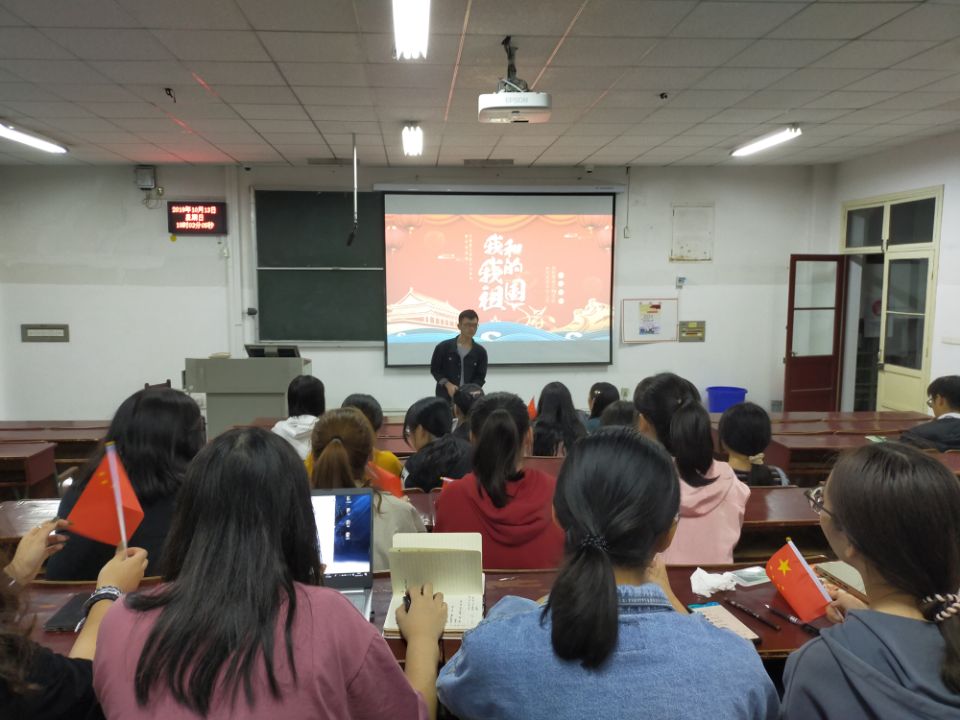 活动开始前,团支书朱思豹为每位同学分发了一面小国旗,大家纷纷表示很惊喜。接着,他以“新中国成立七十周年”这一时代背景为切入点,带领同学们学习和了解了党的三大历史贡献及其带给我们的三大启示。此外,同学们又共同回顾了七十年来党的光辉历程和伟大成就,无论是制度理论,还是经济发展,都取得了很大突破与进步。之后,团支书朱思豹总结道:“奋进新时代,建功正当时。无数个梦想汇聚成中国梦,而中国梦的实现离不开我们每一个人。我们要脚踏实地,自觉培养爱国爱校意识,积极向党组织靠拢,做好筑梦人!”最后,全体同学手持小国旗合唱校歌,歌声嘹亮,整齐划一,宣传委员为大家拍下视频作为留念。