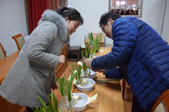 活动伊始,报名参加本次比赛的选手们需要先在公司花房领取水仙花花苗,并亲自植入花盆,然后进行保持水位、控制温度、调节光照等一系列培养步骤。在与老师黄岚杰进行了两次交流后,选手们对水仙花种植技巧和注意事项有了更深入的了解。种植过程中,选手们时常用手机记录下水仙花的每一步成长,拍下其初生的根,测量记录其芽的长度,并积极在花卉协会的官方QQ平台进行互动,分享水仙花的成长过程。尽管天气不尽人意,寝室也是背阳的,水仙花也不能好好晒晒太阳。经过一个月的精心培育,11株水仙花成功养成,老师黄岚杰在展览中对选手们的培育成果予以褒奖,也对一些培育过程中要注意的有关叶片发黄、促进开花、换水等问题提出了宝贵的建议,例如:叶片发黄但依旧需要多晒太阳时,可以用日光灯代替;想要促进水仙开花可以把它的鳞茎切掉一小部分,但是尽量不伤害到里面的茎等。