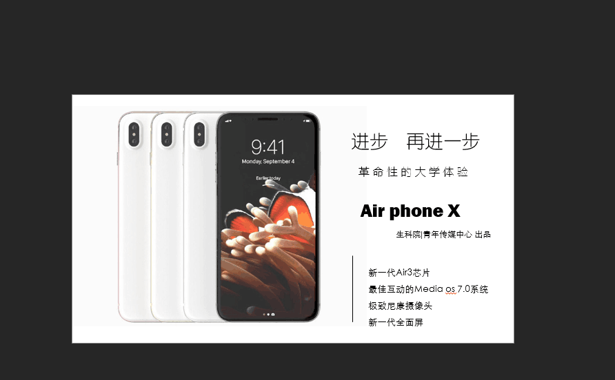 “大家好,欢迎大家来到Air phone X的发布会现场。”这是生科院青年传媒中心副主席毛异之的开场词。当然,他带来的不是新苹果手机而是他所在组织的招新宣讲。“我们给你带来革命性的大学体验。”在毛异之的宣讲中,他将Air phone X的新一代Air3芯片比作行政事务部,最佳互动的Media os 7.0系统比作新媒体部,极致尼康摄像头比作摄影部,新一代全面屏比作编辑部。“因为这四者的结合,苹果迎来了它的巅峰之作,而我们四个部门的结合也为我们青传带来了无限可能。”毛异之表示,这个套用苹果发布会的想法是他在宣讲前五个小时看苹果新机发布会时想到的:“摄影部对应摄像头,行政事务部对应系统,编辑部对应显示屏,新媒体部对应特色功能,主席团对应CPU。”经过润色修改,这个想法成为了现实。