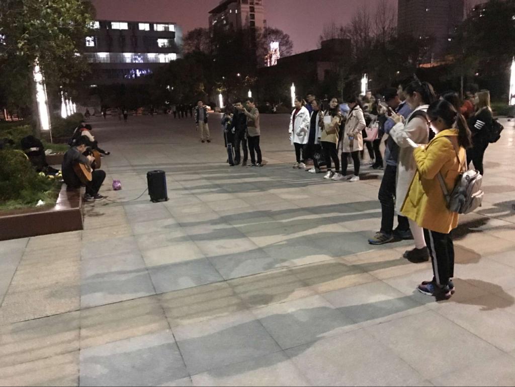 此次活动傍晚八点正式开始。起初他们的周围并没有人群聚集,伴随着演出的开始,悦耳的吉他声开始在广场奏响,行人也纷纷驻足,陶醉其中。期间,吉他协会中几位歌喉出众的同学和着吉他声清唱。在场围观的同学纷纷不自禁地鼓掌喝彩,更有甚者掏出了手机进行拍摄。月光如水,吉他声飞扬,与在长椅上交心的情侣构成了和谐而浪漫的校园图景。